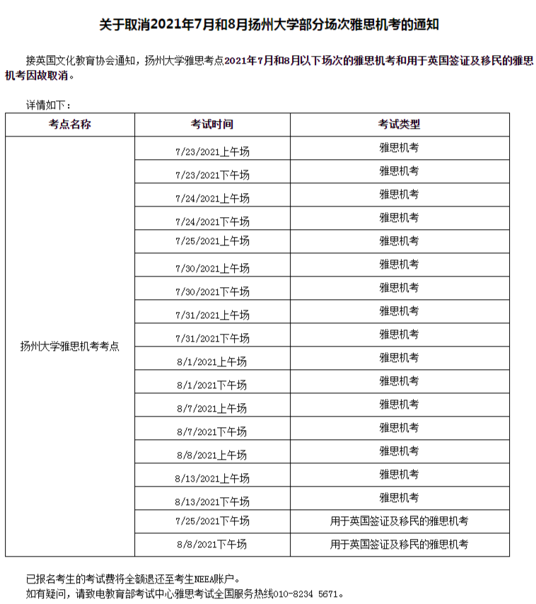 已报名的考生请注意,考试费将全额退还至考生NEEA账户。如有疑问,请致电教育部考试中心雅思考试全国服务热线010-8234 5671。